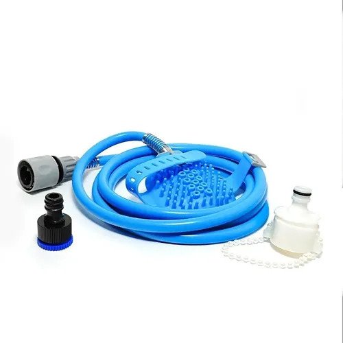 A Luva para banho vem com tubo de 2,30 metros de comprimento e 2 adaptadores de mangueira para caber uma torneira padrão de 1,5 cm